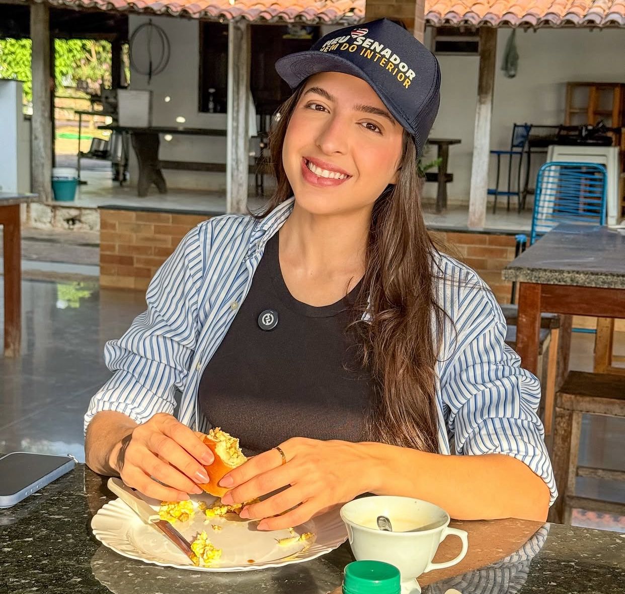 Nas redes sociais, Amanda fez questão de postar o registro, com direito a boné e a frase, “meu senador vem do interior”.