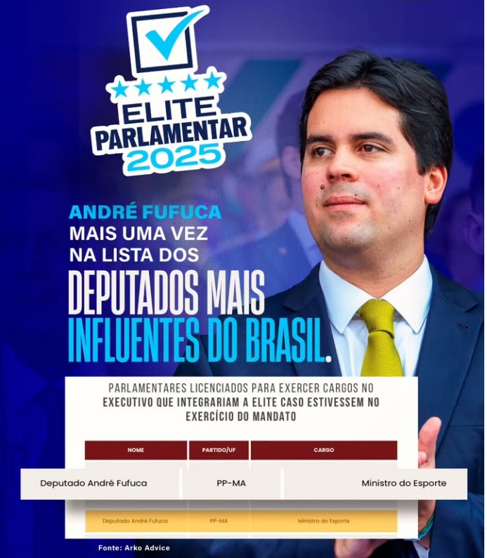 O deputado federal licenciado, André Fufuca, que ocupa o cargo de ministro dos Esportes e é um dos nomes mais cotados para disputar o senador no ano que vem, apareceu mais uma vez, na Elite Parlamentar 2025 do Congresso Nacional, uma lista feita pela Arko Advice entre os “Parlamentares licenciados para exercer cargos no Executivo que integrariam a elite caso estivessem no exercício do mandato”.