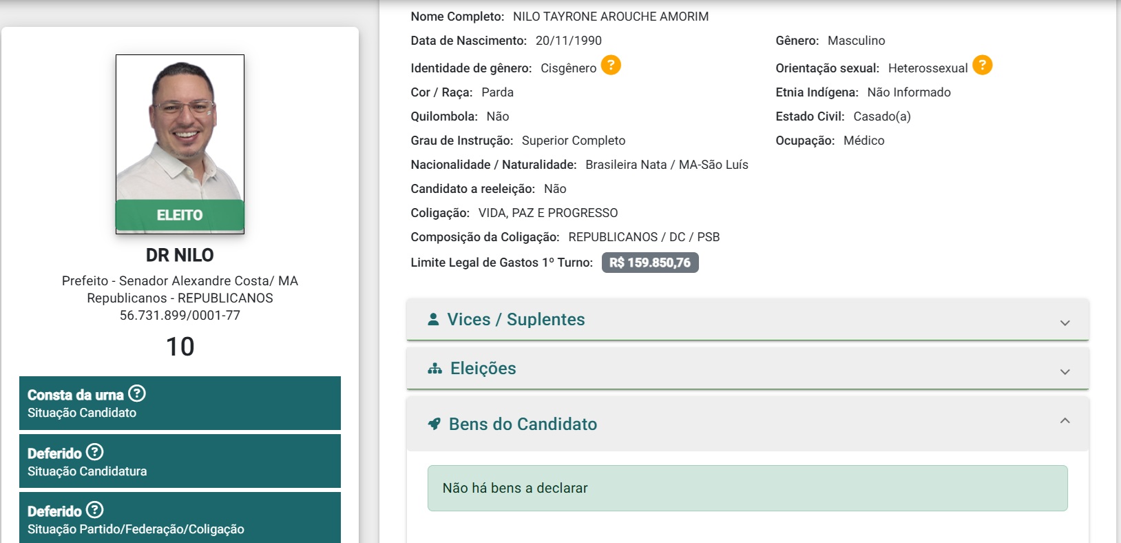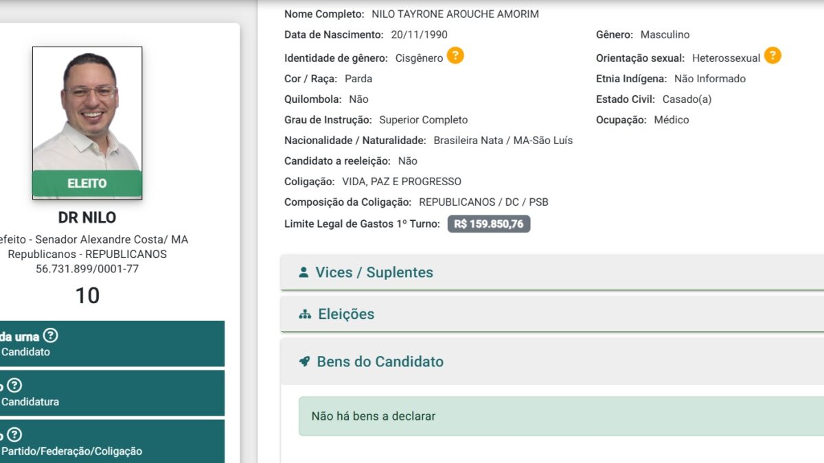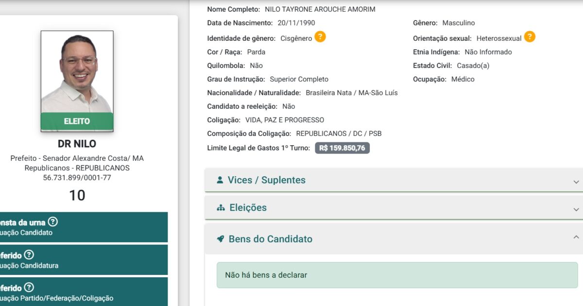 O prefeito do município de Senador Alexandre Costa, Dr. Nilo (PL), não declarou nenhum bem à Justiça Eleitoral na eleição do ano passado.