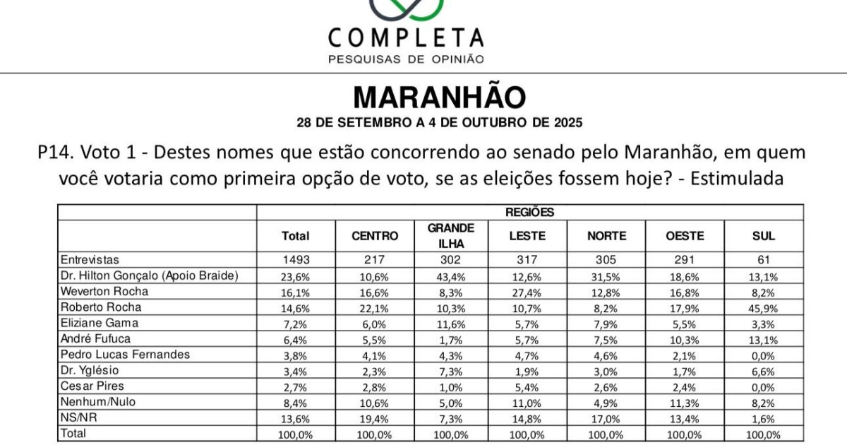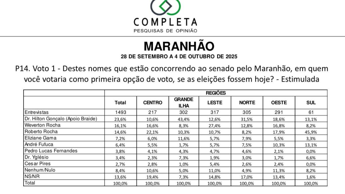 A mais recente pesquisa do Instituto Completa, realizada entre os dias 28 de setembro e 4 de outubro de 2025, revela o peso político que uma eventual aliança entre o prefeito de São Luís, Eduardo Braide, e o médico e ex-prefeito de Santa Rita, Dr. Hilton Gonçalo, pode ter na disputa pelo Senado Federal.